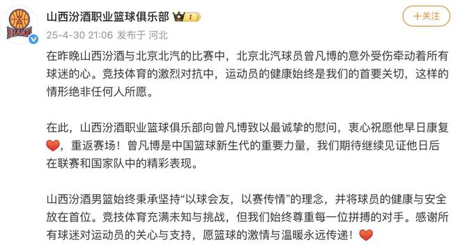 山西男籃官方:向曾凡博致以最誠摯的慰問,祝愿他早日康復(fù)