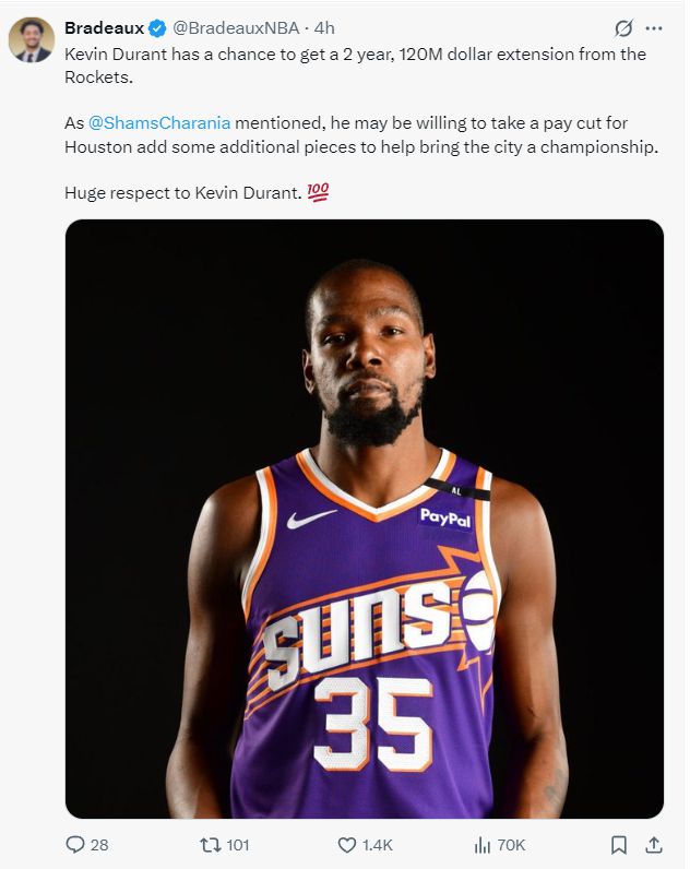 杜蘭特1換8后續(xù):交易規(guī)模或擴(kuò)大 火箭有能力完成另一筆重磅交易