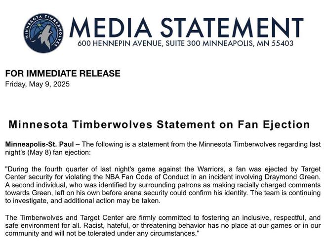 森林狼官方:一名球迷昨日被驅(qū)逐出球場(chǎng),因涉嫌對(duì)追夢(mèng)種族歧視目前被調(diào)查中