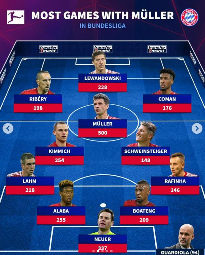 德轉(zhuǎn)盤點穆勒德甲生涯搭檔次數(shù)最多隊友陣:萊萬、諾伊爾在列