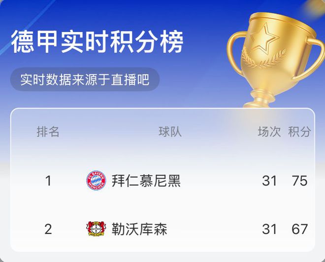 德甲積分榜:拜仁下輪取勝即奪冠,若藥廠不勝拜仁無論勝負均奪冠