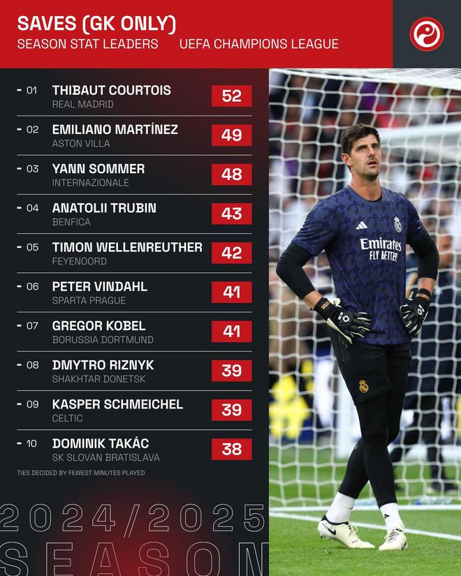 52次,庫(kù)爾圖瓦是本賽季歐冠撲救次數(shù)最多的門將