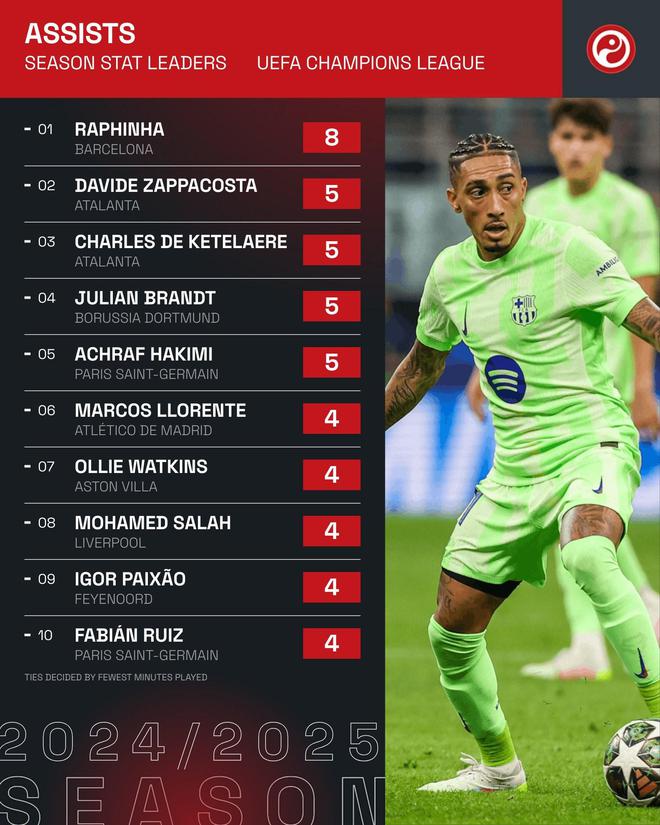8次,拉菲尼亞是本賽季歐冠助攻次數(shù)最多的球員
