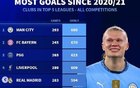 20-21賽季至今五大聯(lián)賽球隊(duì)進(jìn)球榜:曼城690球第1,皇薩分列5/6名